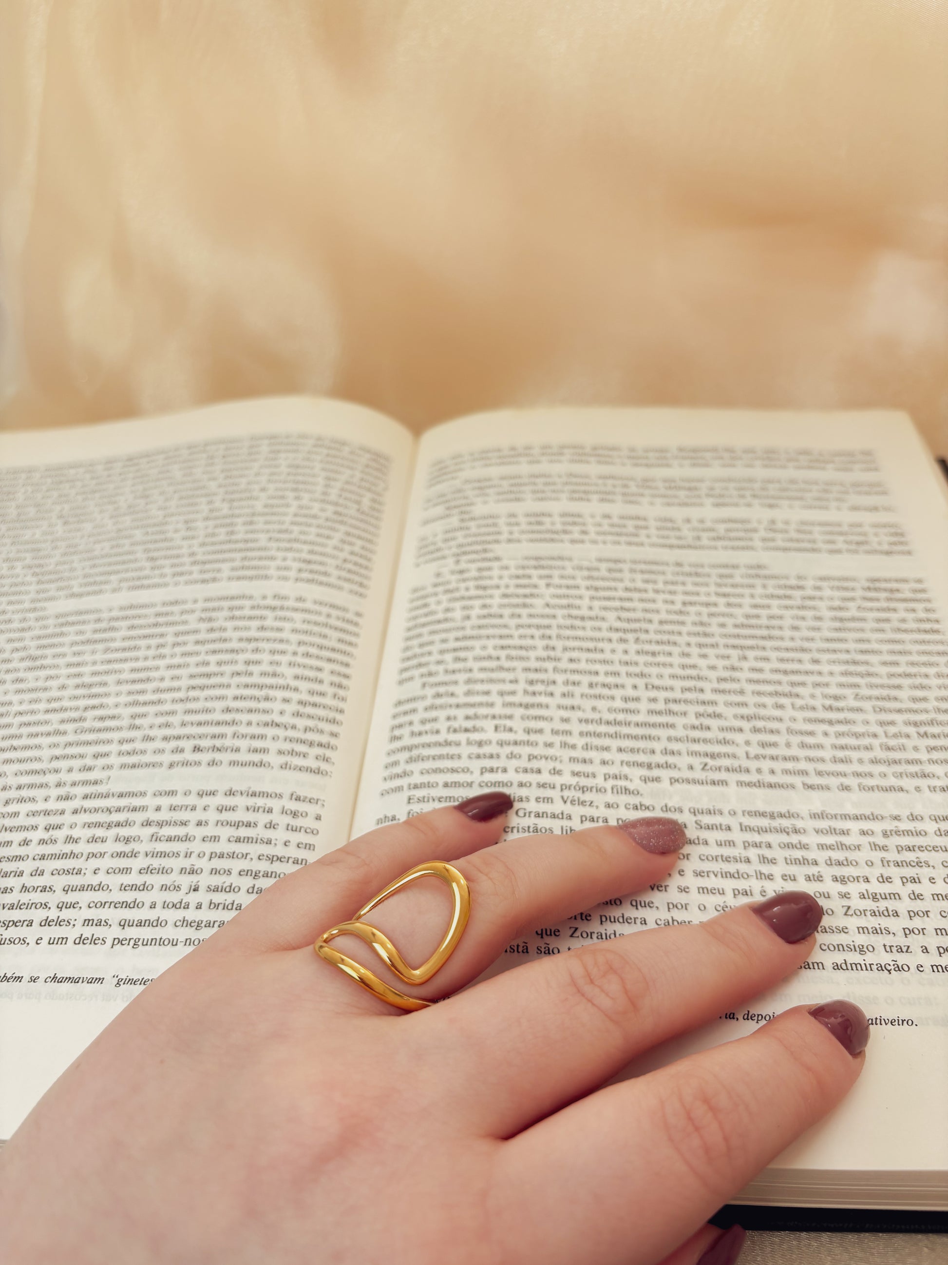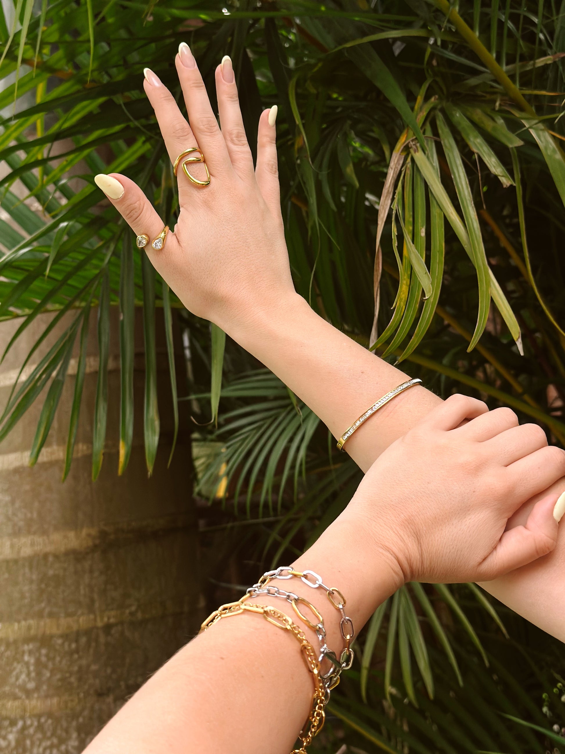 O Anel Veylon apresenta um design moderno e fluido, com curvas que se entrelaçam de forma sutil, criando um visual sofisticado e atemporal. Seu acabamento polido realça o brilho do ouro 18K, tornando-o uma peça coringa para qualquer ocasião — do dia a dia a eventos especiais.