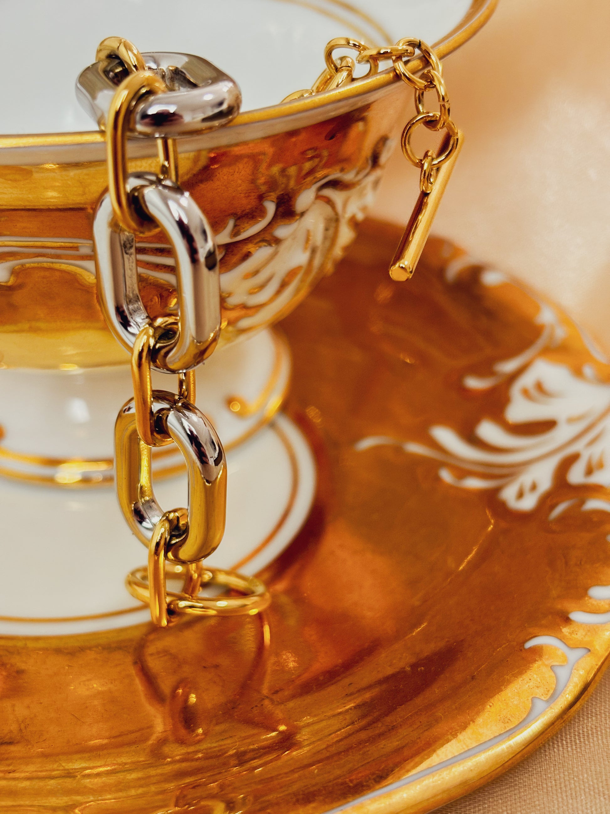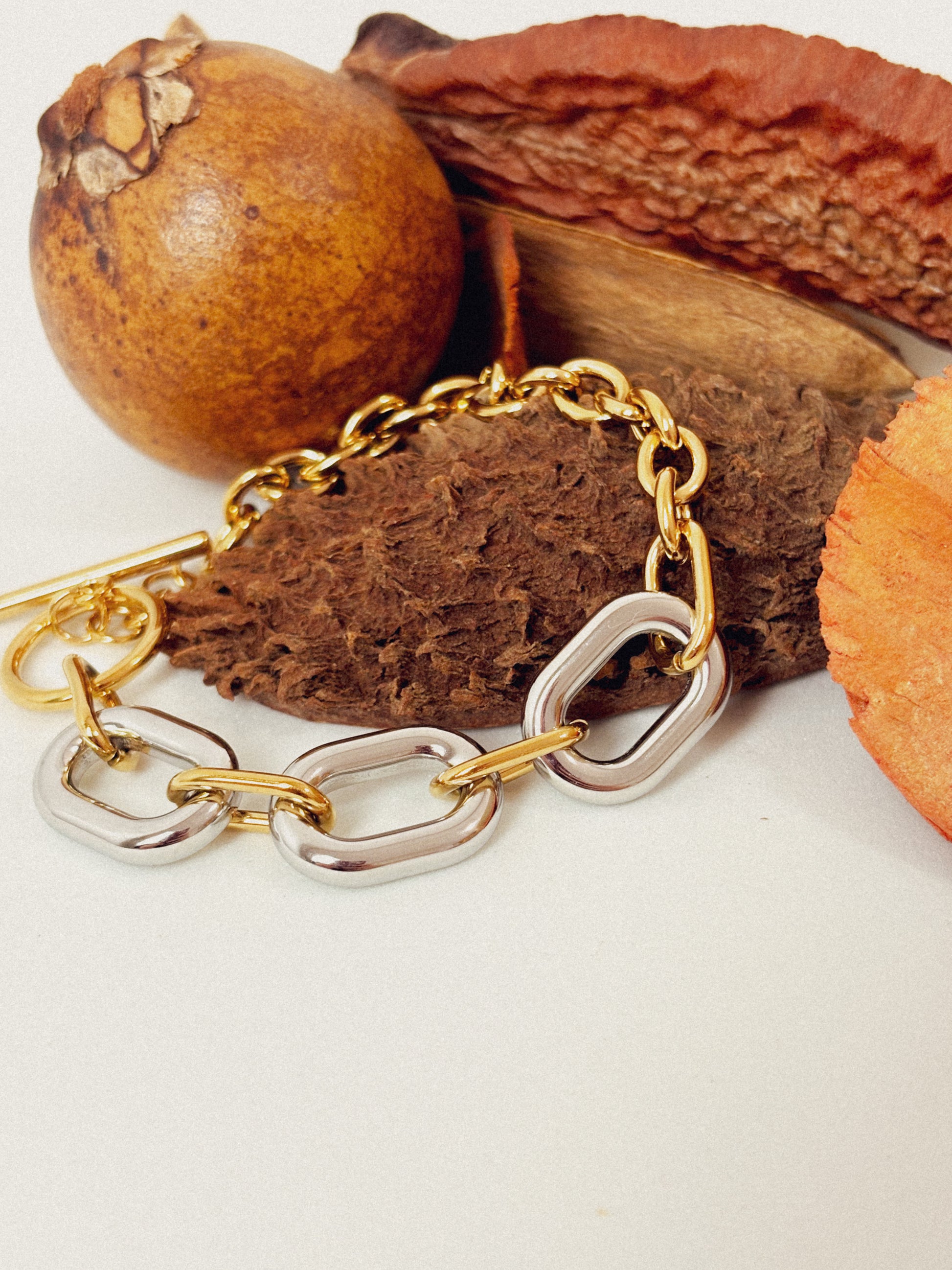 A Pulseira Elvaron é uma peça que traduz personalidade e modernidade. Seu design em elos duplos mescla os tons dourado e prateado, criando um contraste elegante e atemporal. Ideal para quem busca um acessório marcante que combina facilmente com outras joias.