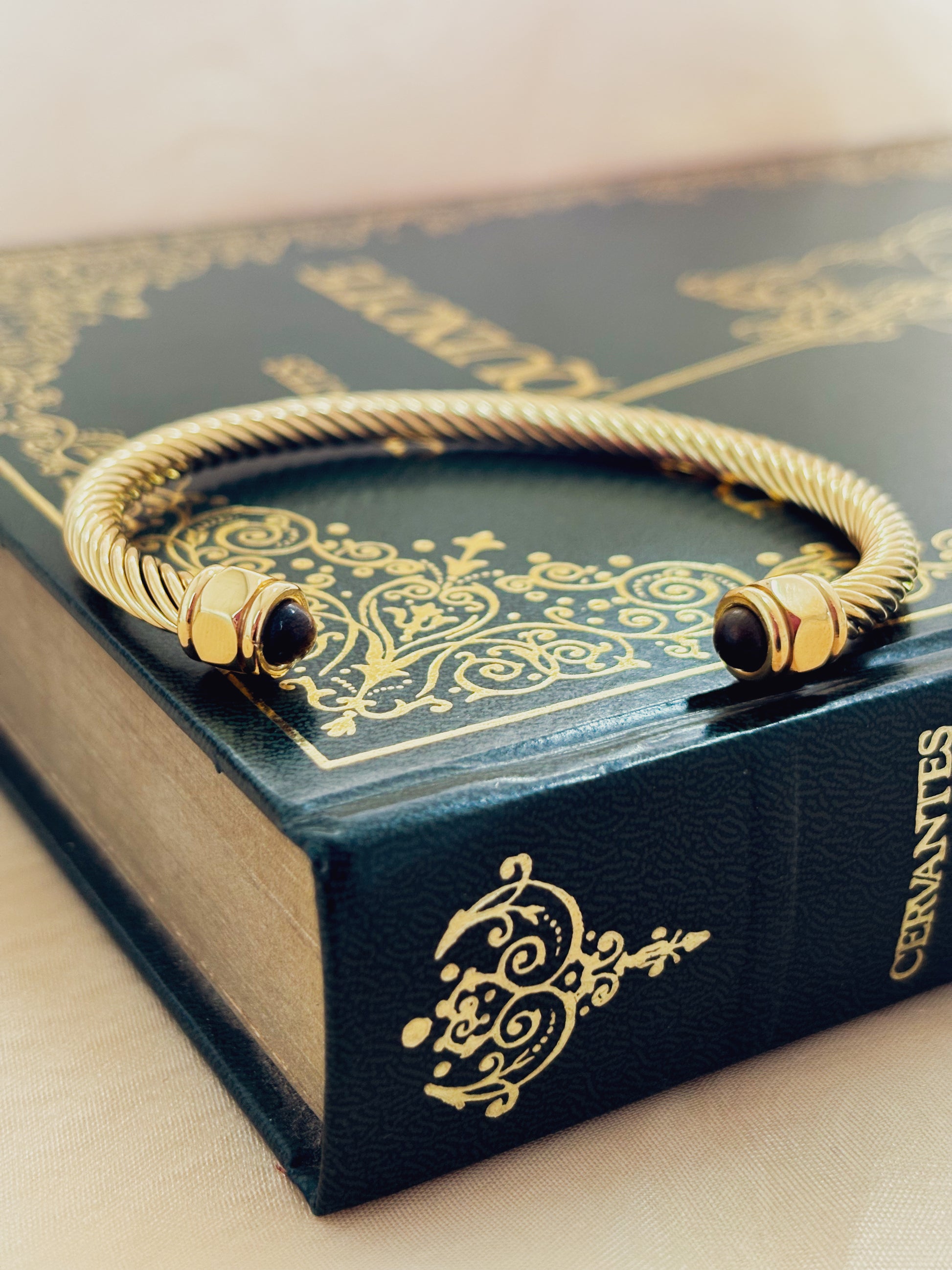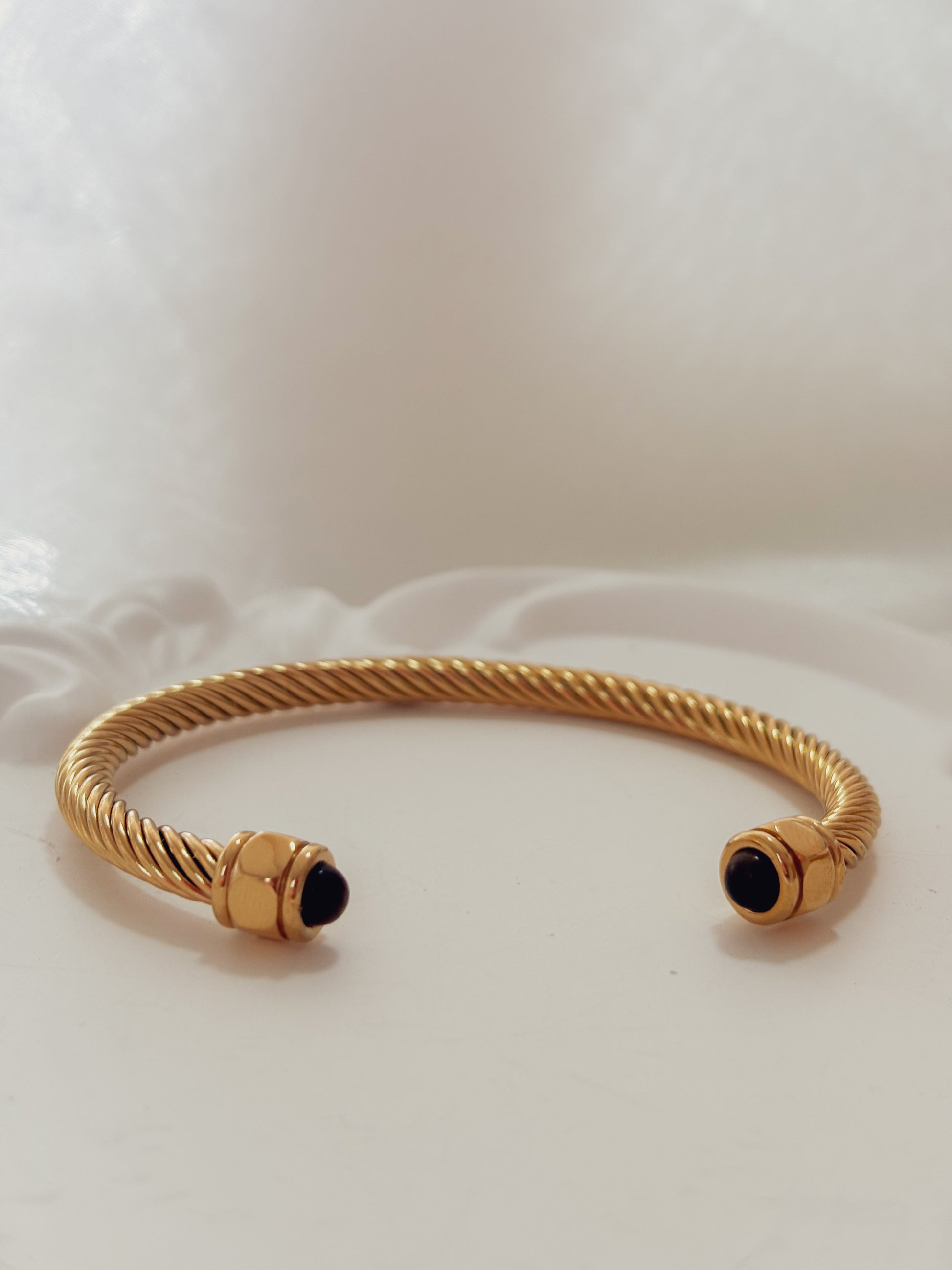 O Bracelete Veyloris é uma peça imponente e elegante, com design em espiral que combina força e sofisticação em cada detalhe. Seu acabamento em ouro 18K realça o brilho e proporciona um visual luxuoso, ideal para quem busca uma joia moderna, marcante e atemporal.