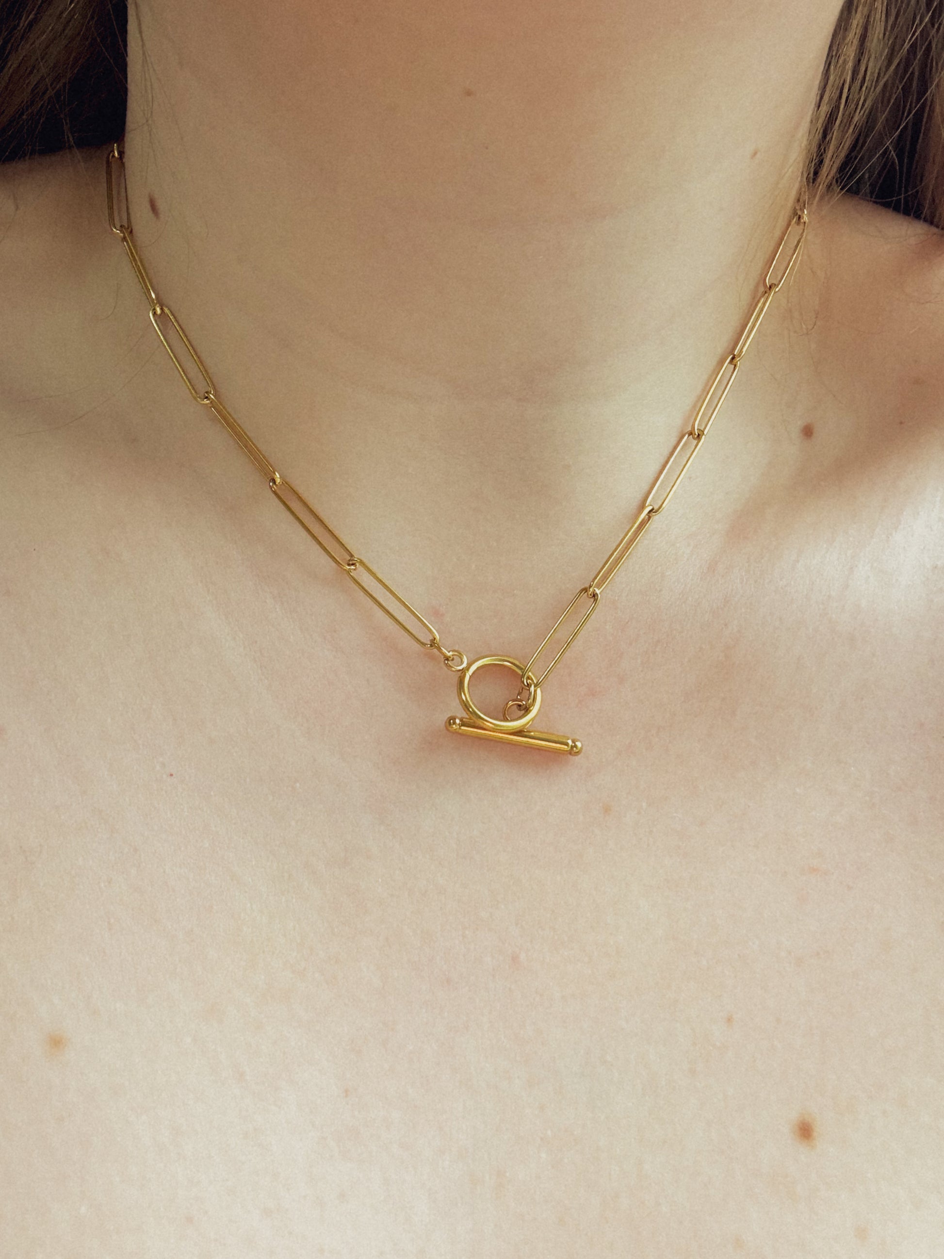 O Colar Melyze é uma peça moderna e sofisticada, com corrente estilo elos alongados e fecho frontal em formato T, que traz um toque contemporâneo e elegante. Ideal para compor looks versáteis e destacar o colo com sutileza e personalidade.