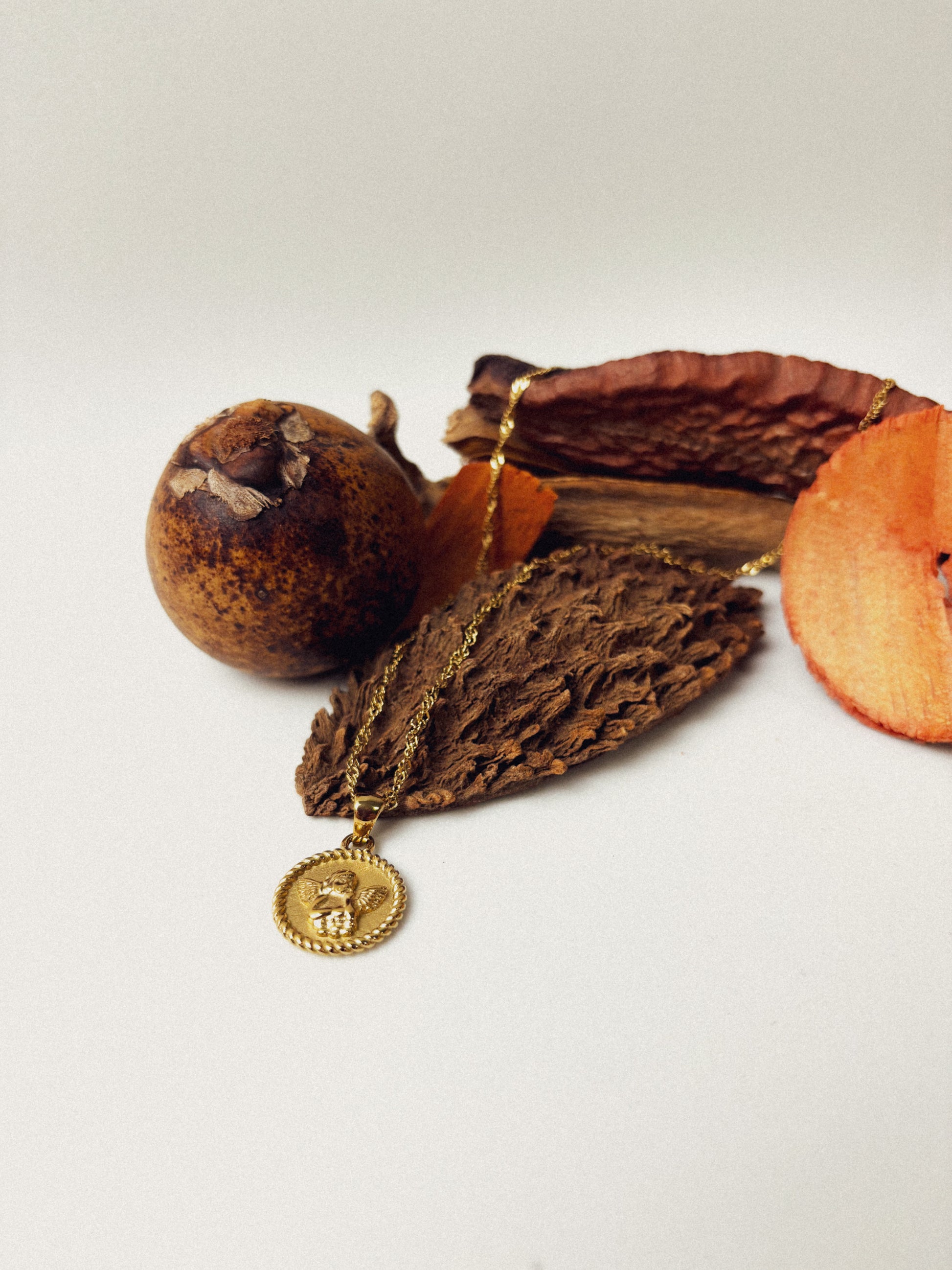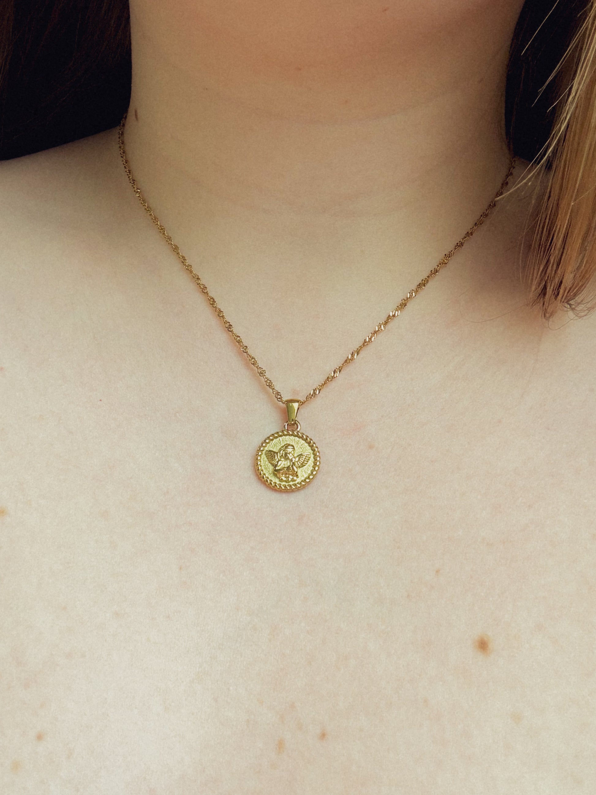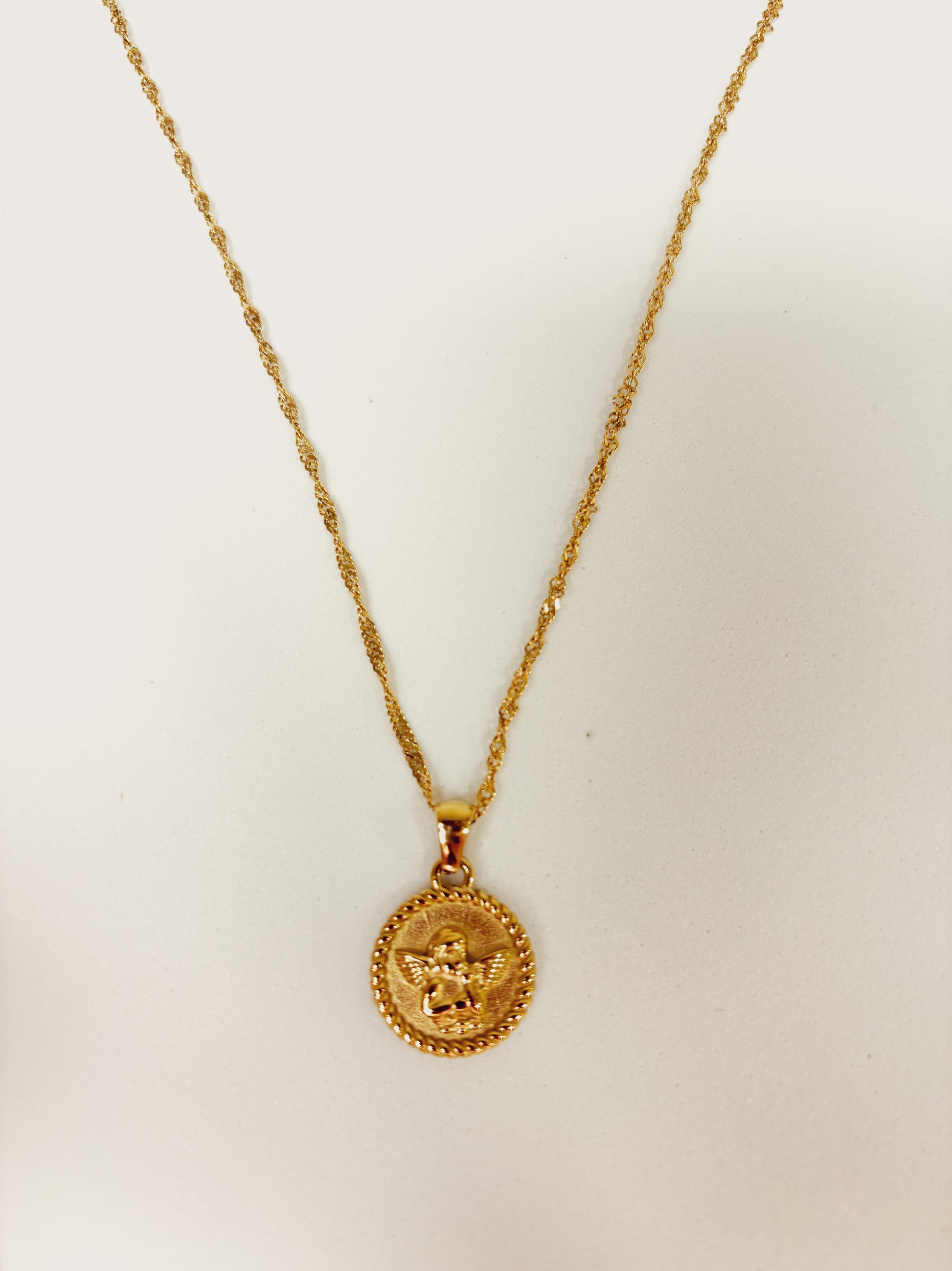 O Colar Thalvoria traz um pingente delicado em formato de medalha com relevo detalhado, combinando simbologia clássica e acabamento elegante. Ideal para uso individual ou em composição com outras peças, ele acrescenta sofisticação e presença ao visual.