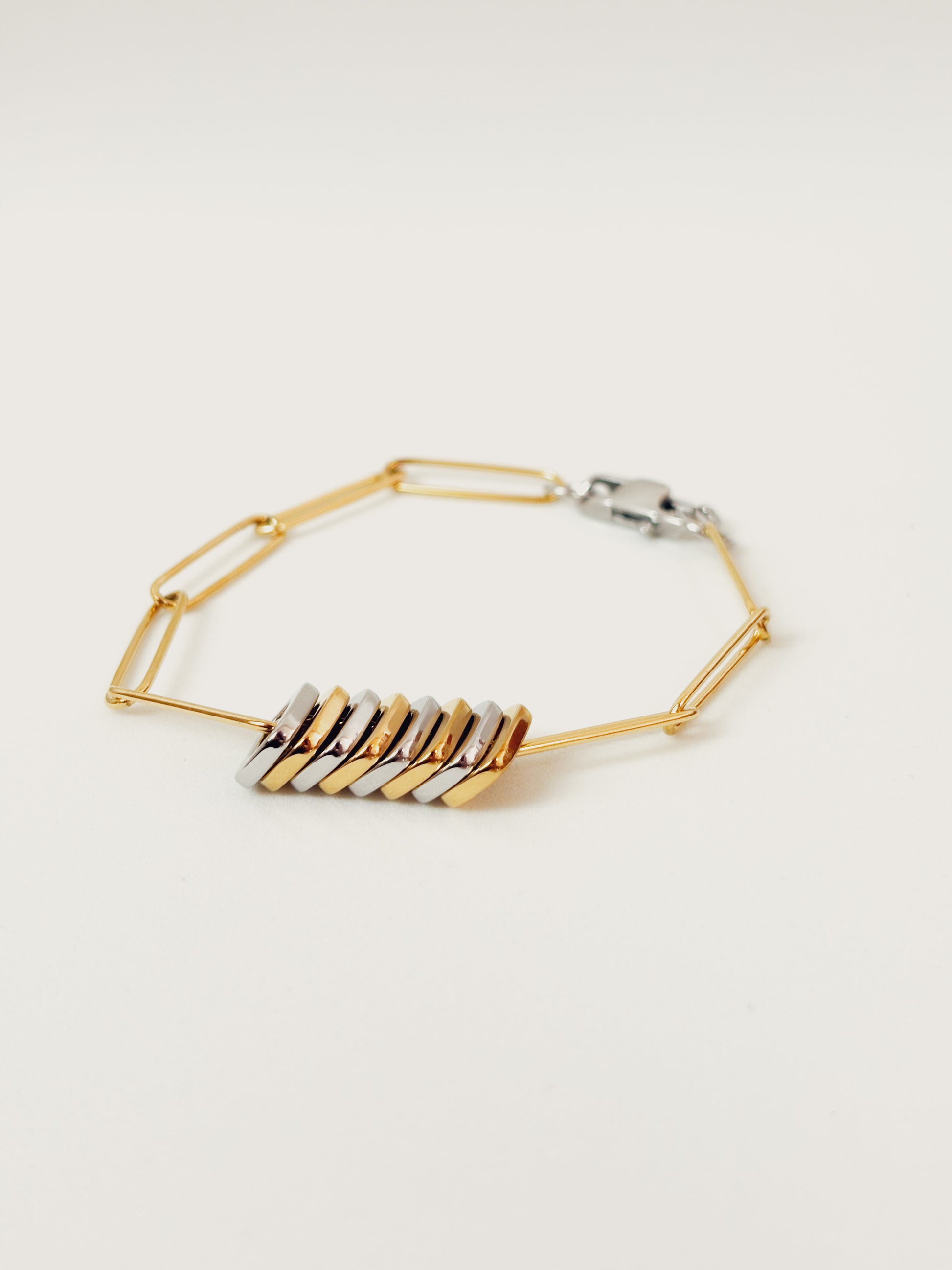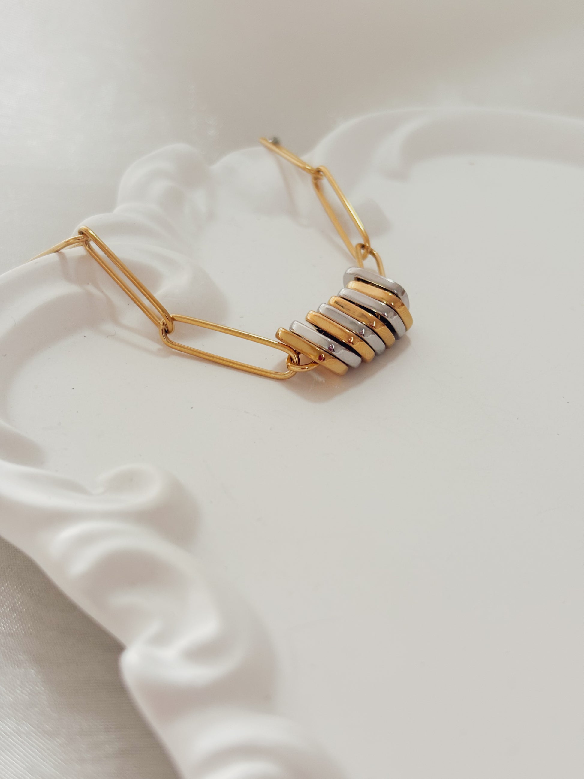 A Pulseira Calenne combina linhas minimalistas com um toque moderno e sofisticado. Seu design com elos alongados e detalhes em anéis banhados a ouro 18K cria uma peça elegante e versátil, perfeita para complementar qualquer look, do casual ao refinado.