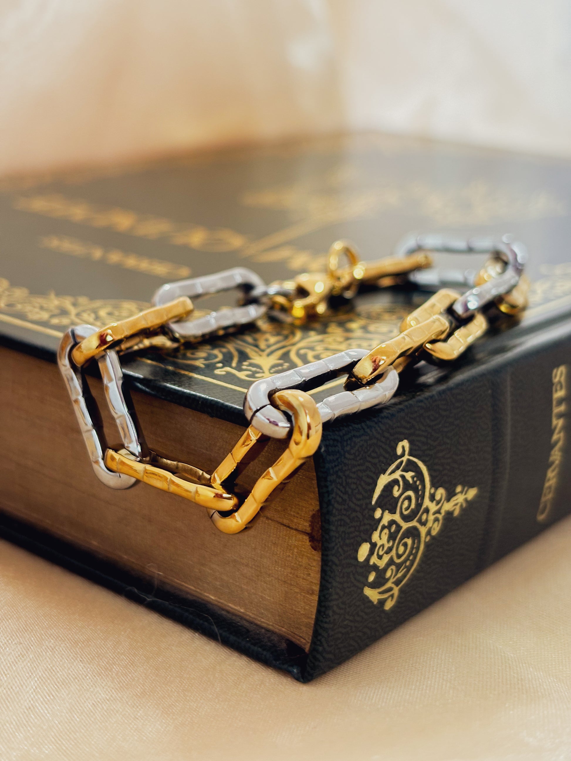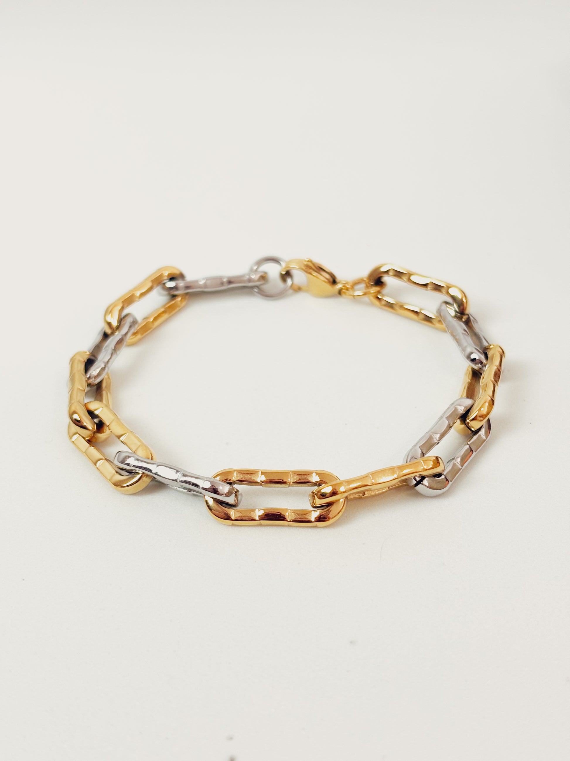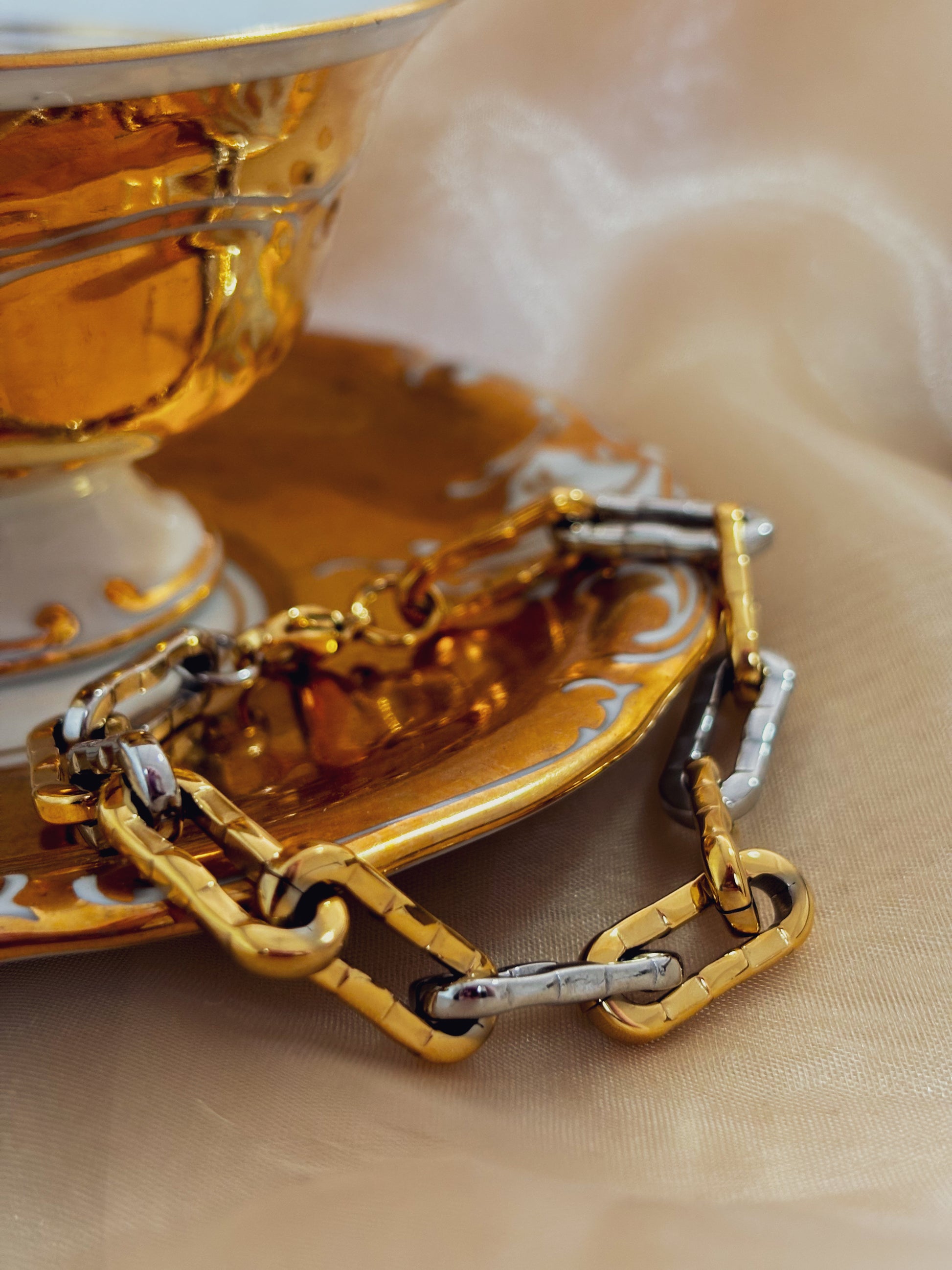A Pulseira Kaelora combina o contraste marcante entre os tons de dourado e prateado, formando uma peça moderna e sofisticada. Seus elos alongados criam um design versátil que se destaca tanto em composições casuais quanto elegantes, refletindo o equilíbrio entre força e delicadeza.